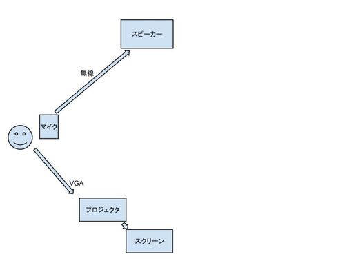 前提条件 ・Thunderboltのあるmacbook(Air|Pro)を持っている ・エイチーム(名古屋のルーセントタワー)でやる 図. エイチームの環境 画像はVGAでつないで、音声は無線マイクを使っている。気にすべきところは、画質と音質と通信の3つ。画質と音質は独立させ…